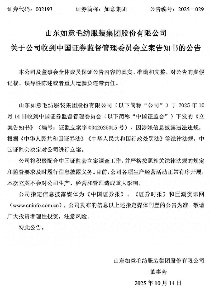 10月14日晚间,如意集团(002193.SZ)公告称,公司于2025年10月14日收到中国证监会下发的《立案告知书》,因涉嫌信息披露违法违规,根据相关法律法规,中国证监会决定对公司进行立案。