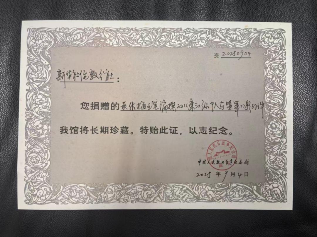中国人民抗日战争纪念馆发来的捐赠证书。