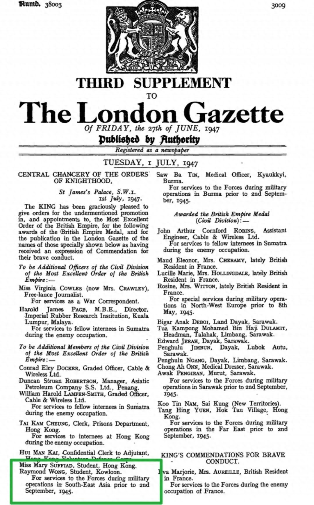 这是《伦敦宪报》登载的关于新华社伦敦分社首任社长黄作梅(英文名“Raymond Wong”)在二战时期参与营救盟军人员被英王乔治六世授勋的报道。