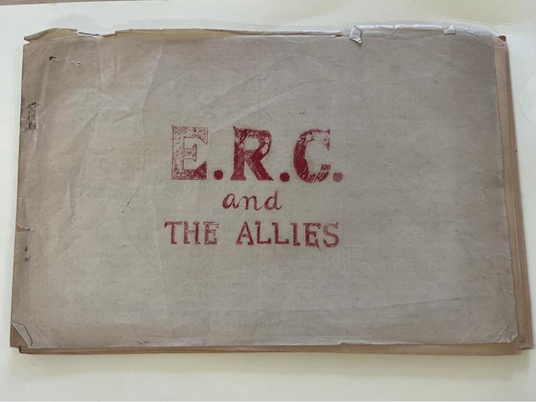 普通信纸大小的笔记册封面用红字写着英文“东江纵队与盟军”,它未经装订,只是用别针夹着,纸张早已泛黄发黑、页边出现脆化、甚至有纸片脱落。