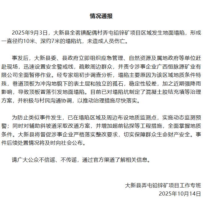 据“今日大新”微信公众号消息,广西崇左市大新县弄屯铅锌矿项目工作专班15日发布情况通报称,2025年9月3日,大新县全茗镇配偶村弄屯铅锌矿项目区域发生地面塌陷,形成一直径约10米、深约7米的塌陷坑,未造成人员伤亡。