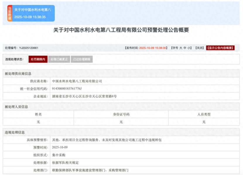 截图源自军队采购网《关于对中国水利水电第八工程局有限公司预警处理公告概要》