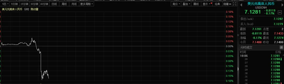 今天早上,人民币中间价升至7.10元强方,为去年11月来首次。人民币兑美元中间价报7.0995,上调26点;上一交易日中间价7.1021,上一交易日官方收盘价7.1411。随后,离岸人民币直线拉升。