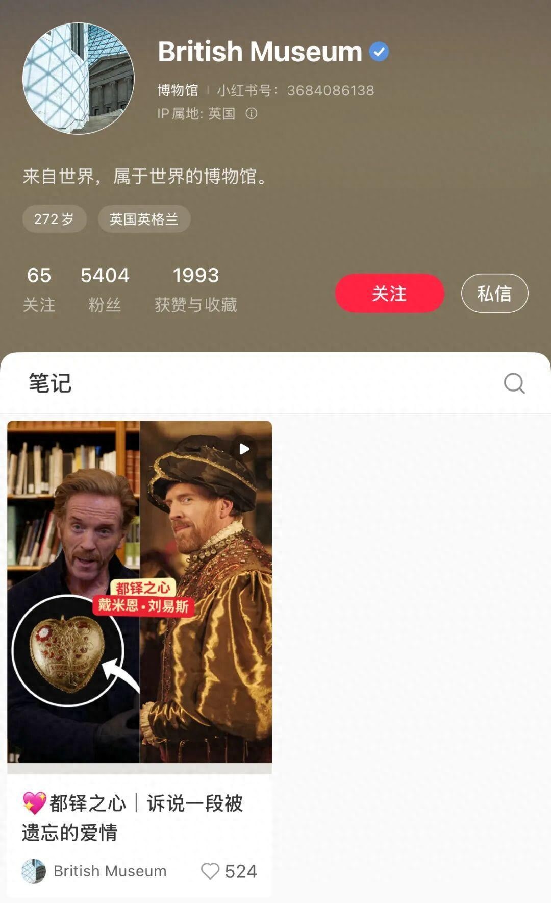 据查询,该账号名称为British Museum,身份认证为博物馆,账号简介为“来自世界,属于世界的博物馆”,账号目前拥有5400多名粉丝。