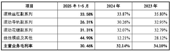 与此同时,滚珠丝杠行业竞争日趋激烈,南京工艺毛利率呈现逐年下降态势,由2023年的34.1%下降至2024年的32.14%,2025年前5月则为30.46%。南京工艺解释称,毛利率下滑主要系市场竞争加剧,产品价格竞争白热化,公司为保持市场份额相应调整了部分产品定价策略。