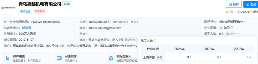 界面新闻记者根据天眼查信息致电青岛嘉越机电有限公司,截止发稿未取得联系。