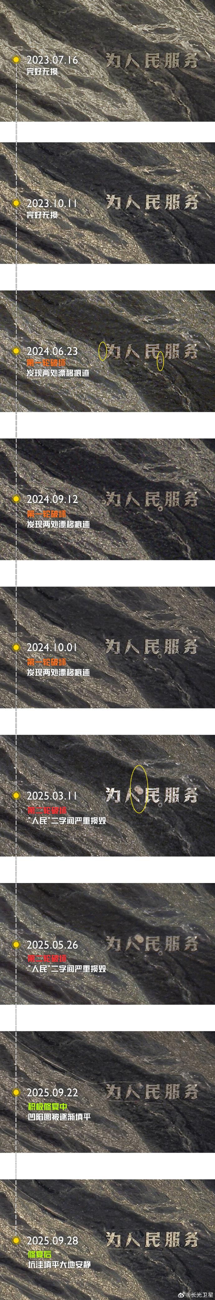 10月14日,“长光卫星”官方账号晒出修复前后对比图并发文称:“吉林一号”卫星记录哈密戈壁滩“为人民服务”大字破坏、修复全过程。2024年,哈密戈壁滩“为人民服务”大字逐渐遭人开车漂移破坏。越野爱好者在标语上肆意漂移,留下了一个个刺眼的圆圈痕迹,尤其是 “人民” 二字中间的地貌破坏极为严重,留下的沟壑深度可达一掌,不仅破坏了戈壁景观,更是对历史和先辈的亵渎。