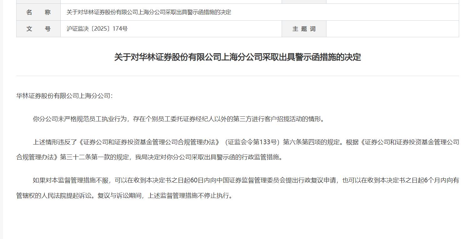 因此,上海证监局局决定对华林证券上海分公司采取出具警示函的行政监管措施。