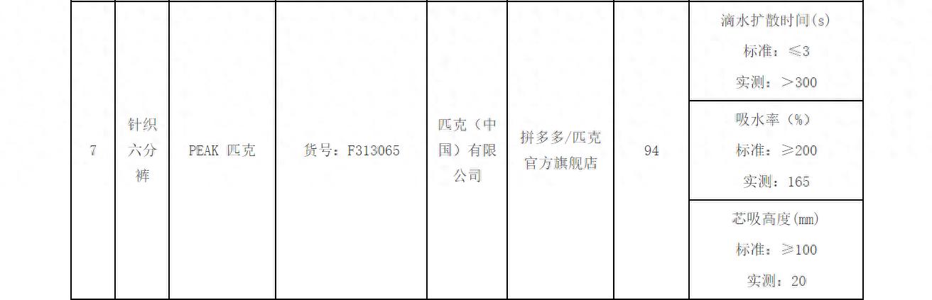 2022年8月,在对部分吸湿速干类服装、防晒类服装、冰袖及帽子等86个品牌样品开展比较试验后,北京市消费者协会发布“吸湿速干防紫外线服装比较试验结果”。其中,PEAK匹克一款针织六分裤不符合标准,问题指向滴水扩散时间、吸水率以及芯吸高度。