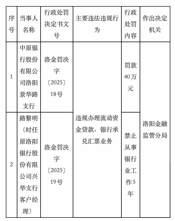 同时,时任原洛阳银行股份有限公司兴华支行客户经理路黎明,被禁止从事银行业工作5年。