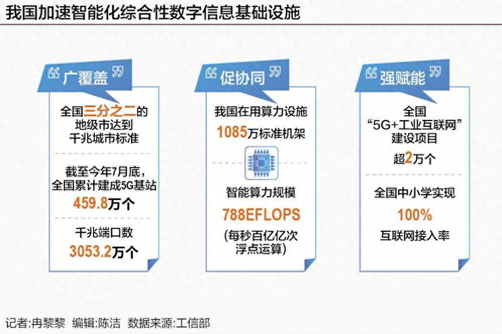 在国务院新闻办公室举行的“高质量完成‘十四五’规划”系列主题新闻发布会上,根据工业和信息化部、国家数据局发布的内容,我国建成全球技术领先、规模最大的信息通信网络。截至今年7月底,全国累计建成5G基站459.8万个,千兆端口数达3053.2万个。另外,算力总规模位于全球第二。我国在用算力设施达1085万标准机架,智能算力规模达788EFLOPS(每秒百亿亿次浮点运算)。