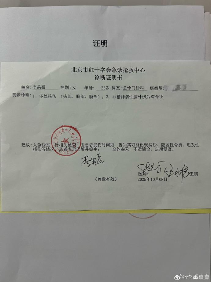 李禹熹提到,10月7日,两人再次因为荣梓杉与某上戏女生的关系发生争吵。10月8日,她前往荣梓杉家中“想要好好聊聊”时,被对方“二话没说就给我拎住摔倒在地,摔了我两次,我头和肩直接磕地上……进门前还踹了我一脚”。李禹熹随后在微博出示立案告知书以及诊断书,诊断书显示,其身体受到多处损伤。