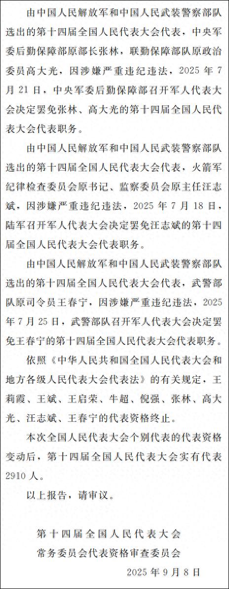 由中国人民解放军和中国人民武装警察部队选出的第十四届全国人民代表大会代表,武警部队原司令员王春宁,因涉嫌严重违纪违法,2025年7月25日,武警部队召开军人代表大会决定罢免王春宁的第十四届全国人民代表大会代表职务。
