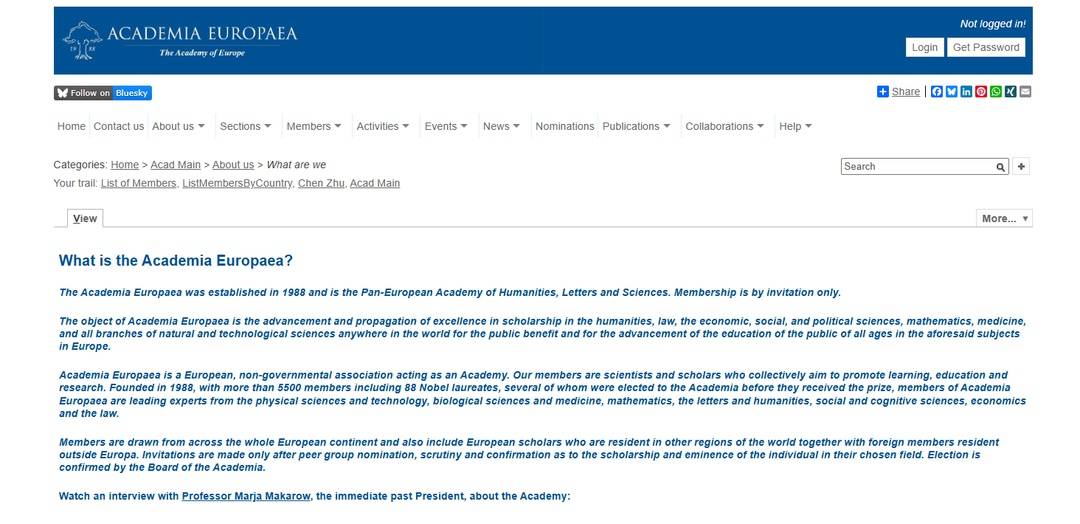 据欧洲科学院(Academia Europaea,也常译为欧洲人文和自然科学院)官网介绍,其成立于1988年,是一个非政府组织,由英国皇家学会联合多家代表欧洲各国最高学术水平的国立科学院共同发起设立,总部位于英国伦敦。 目前,欧洲科学院(Academia Europaea)拥有5500多名院士,其中包括88位诺贝尔奖获得者,代表欧洲人文和自然科学界最优秀的科学精英和学术权威。