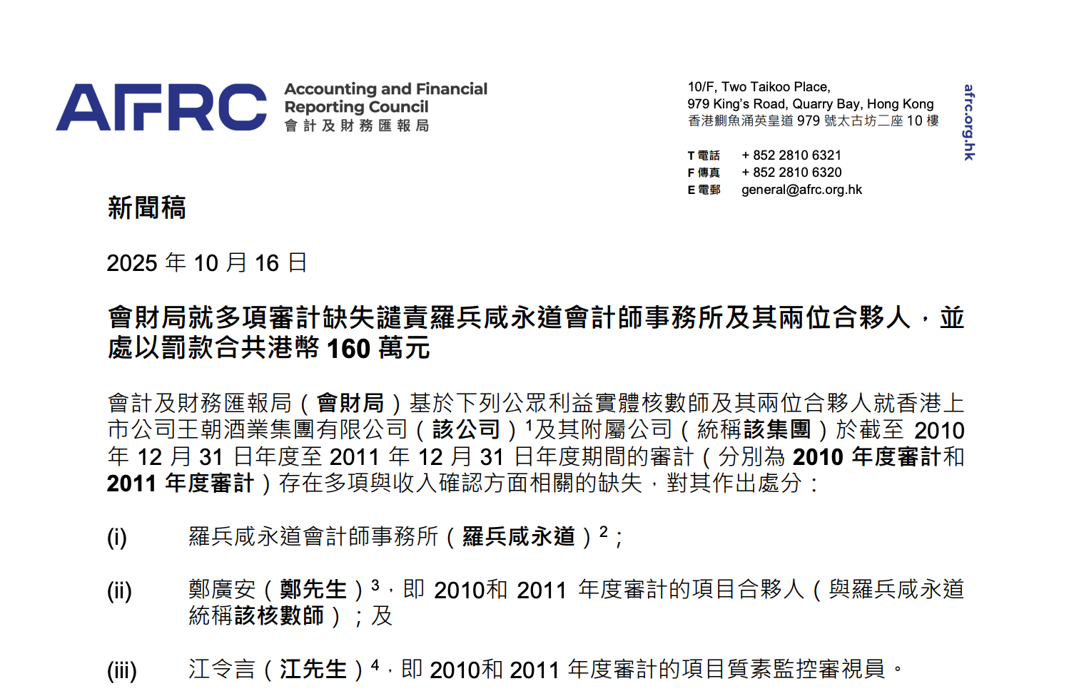 香港会计及财务汇报局(香港会财局)10月16日公告称,就多项审计缺失谴责罗兵咸永道会计师事务所(即普华永道在香港分支机构,以下简称罗兵咸永道)及其两位合伙人,并处以罚款共160万港元。