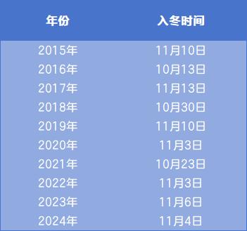 按照《气候季节划分》国家标准,依据当年5天滑动平均气温序列,在首次连续5个满足小于10℃的滑动平均值所对应的日平均气温序列中,按第一个小于10℃的日期作为冬季起始日。