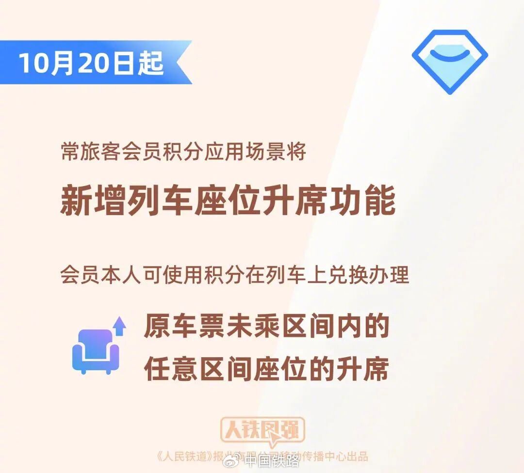 目前,常旅客会员积分可为本人或指定受让人兑换火车票,兑换火车票时100积分可抵1元使用,兑换的车票可办理1次改签并扣减部分积分作为改签费,不办理退票、变更到站业务。10月20日起,常旅客会员积分应用场景将新增列车座位升席功能,会员本人可使用积分在列车上兑换办理原车票未乘区间内的任意区间座位的升席。乘车途中,会员可扫描座椅扶手上的“铁路畅行”二维码登记升席需求,也可直接联系列车工作人员办理;接到旅客升席需求后,列车工作人员将根据列车座席空余情况及时进行办理。使用会员积分升席后的新车票不能办理退票、改签业务,因不可抗力或铁路责任造成升席车票不能使用时,可办理退票,升席车票未乘区间的积分将返回会员账户。