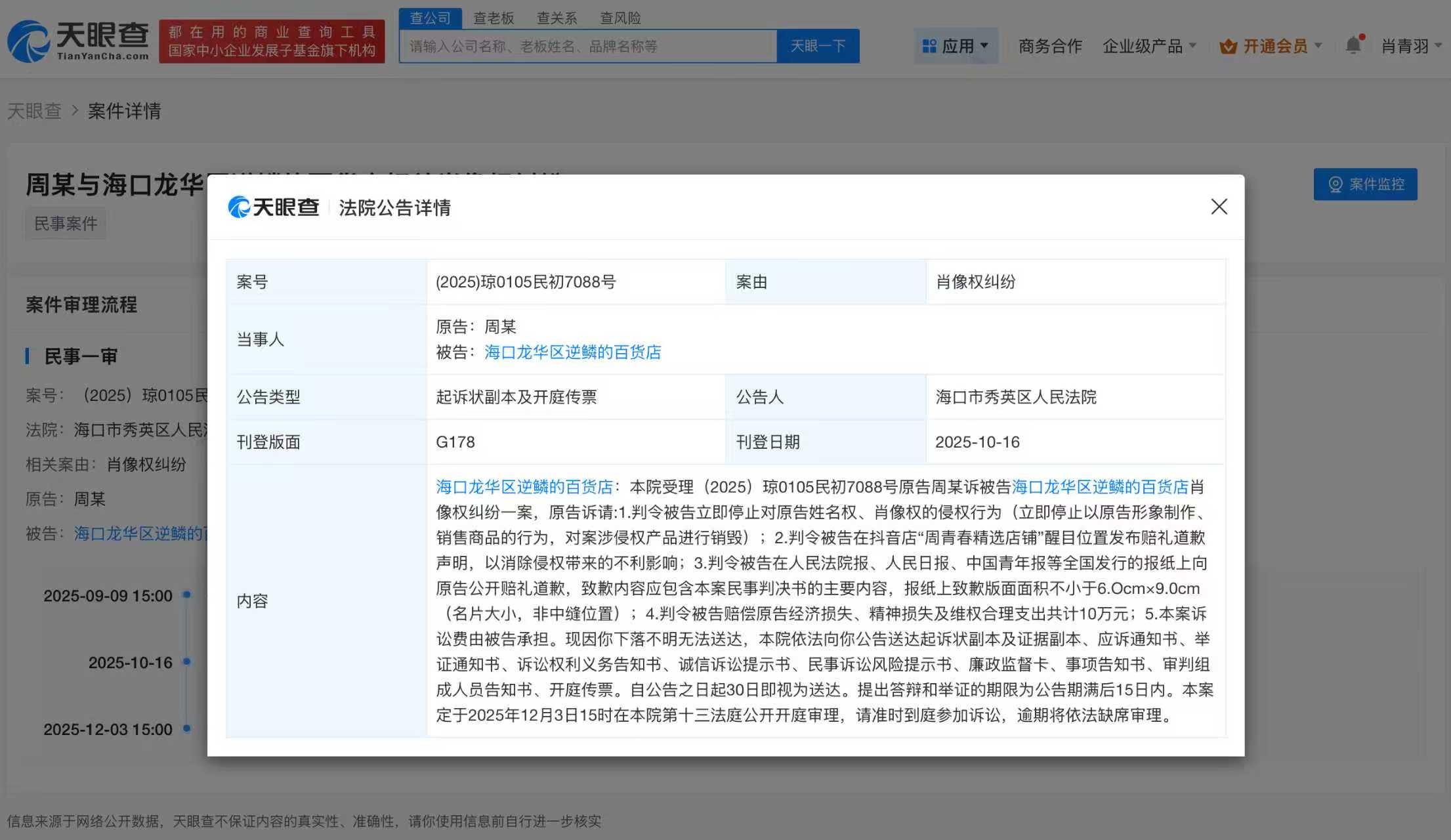 天眼查App显示,近日,海口市秀英区人民法院向海口龙华区逆鳞的百货店公告送达起诉状副本及证据副本、开庭传票等,涉及与周杰伦相关肖像权纠纷。公告显示,周杰伦请求判令被告立即停止对其姓名权、肖像权的侵权行为,在网店发布赔礼道歉声明,并在全国发行的报纸上公开赔礼道歉。同时,判令被告赔偿其经济损失、精神损失及维权合理支出共计10万元。自公告之日起30日即视为送达,并定于2025年12月3日开庭审理。
