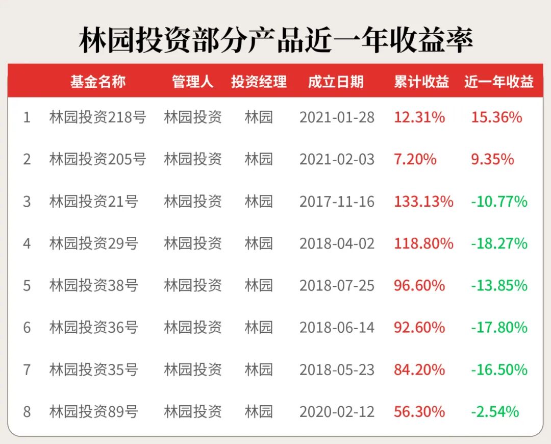 根据私募排排网数据,林园旗下18只有业绩披露的产品今年均跑输沪深300指数。即便收益表现较好的“林园投资218号”,近一年15.36%的收益,仍低于沪深300同期18.77%的涨幅。而例如“林园投资21号”等产品,年内更是出现了小幅亏损。