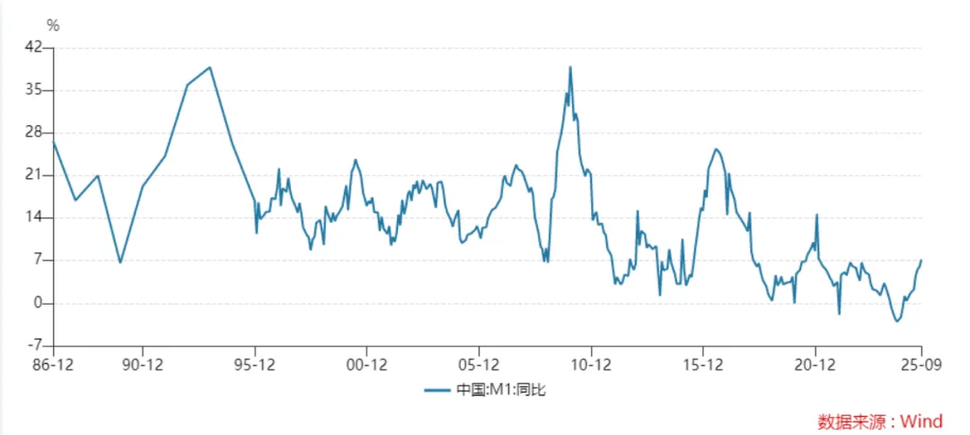 首先,2025年9月金融数据显示,新增社融和人民币贷款虽同比小幅下滑,但整体仍高于市场预期,反映出信贷端在银行发力下具备一定韧性。2025年9月M2增速小幅回落至8.4%,较前值下降0.4个百分点;M1则快速回升至7.2%,较前值上升1.2个百分点。从A股的上涨逻辑来看,M1回升,一般都对应着权益市场上涨。