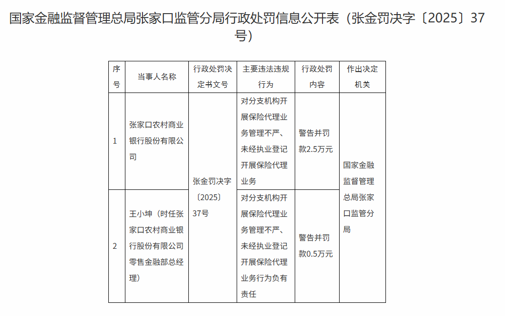 10月17日,国家金融监督管理总局张家口监管分局行政处罚信息公开表显示,张家口农村商业银行股份有限公司因对分支机构开展保险代理业务管理不严、未经执业登记开展保险代理业务,被警告并罚款2.5万元。同时,王小坤(时任张家口农村商业银行股份有限公司零售金融部总经理)因对分支机构开展保险代理业务管理不严、未经执业登记开展保险代理业务行为负有责任,被警告并罚款0.5万元。
