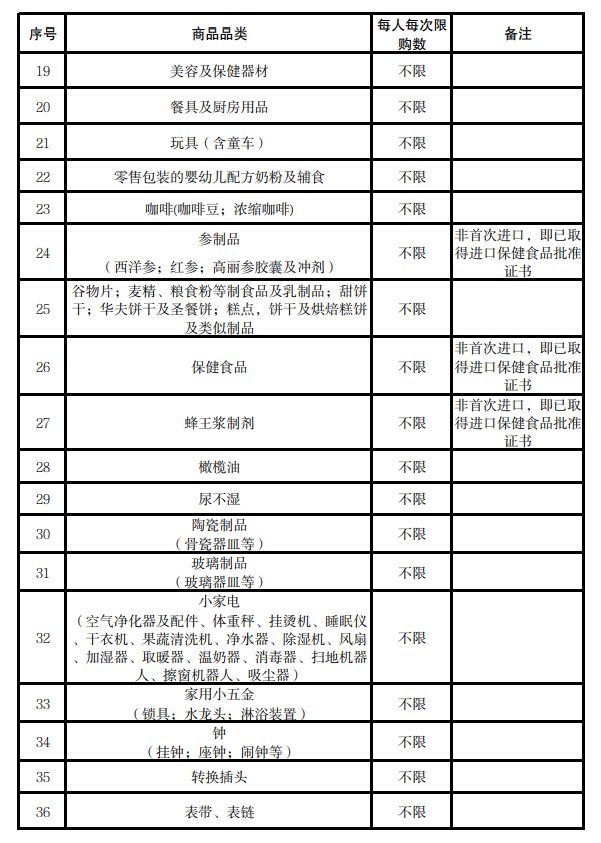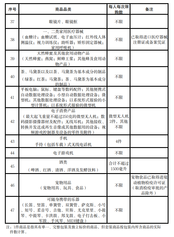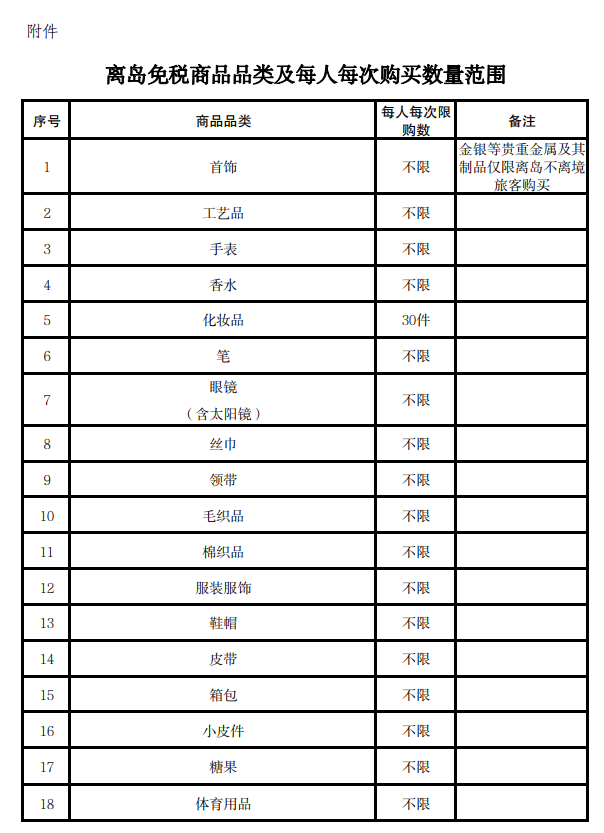 调整后离岛免税商品共47类,具体品类、购买数量、备注要求见附件,并按此执行。
