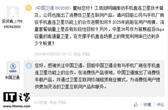 中国卫通今日在投资者互动平台透露,目前中国卫通没有与手机厂商在手机直连卫星功能上的合作。在消费级产品领域,中国卫通推出了消费级车载产品,并通过卫星互联网终端租赁商业模式,为消费级用户提供更加灵活的卫星互联网产品和服务。