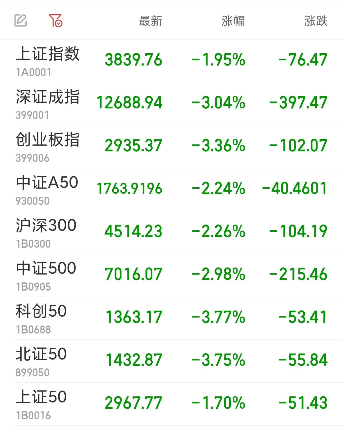 周五,A股三大指数集体下跌,上证指数失守3900点关口。截至收盘,上证指数跌1.95%,报3839.76点;深证成指跌3.04%,报12688.94点;创业板指跌3.36%,报2935.37点。