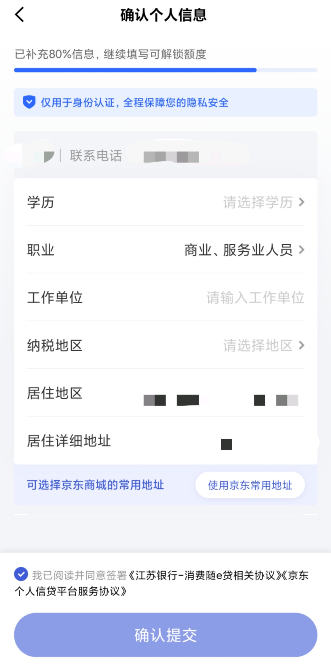 在时代周报记者体验过程中,多家平台要求输入身份证信息以及进行人脸识别。其中京东借钱还额外要求输入学历、职业、工作单位、纳税地区、地址等详细信息。信息输入几分钟之后,多家平台显示已通过资质审核,时代周报记者随即收到了短信提醒,获批额度在6.07万元~20万元不等,单利最低7.56%,年化利率均低于24%的上限。
