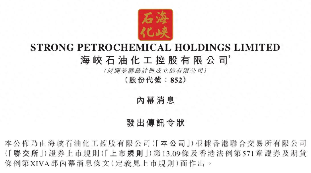 10月17日晚间,海峡石油化工公告称,10月15日,公司间接全资附属公司海峡石油化工有限公司(下称“海峡香港”)对海峡香港前董事姚国梁先生及谭笑先生向香港特别行政区高等法院提交传讯令状,指称被告人于海峡香港于2024年末与外部订约方进行之有关原油买卖交易中违反其对海峡香港所负之受信、普通法及╱或法定责任,要求被告人向海峡香港偿付其于所指称之交易中所蒙受之损失及损害,金额约为人民币3700万元。
