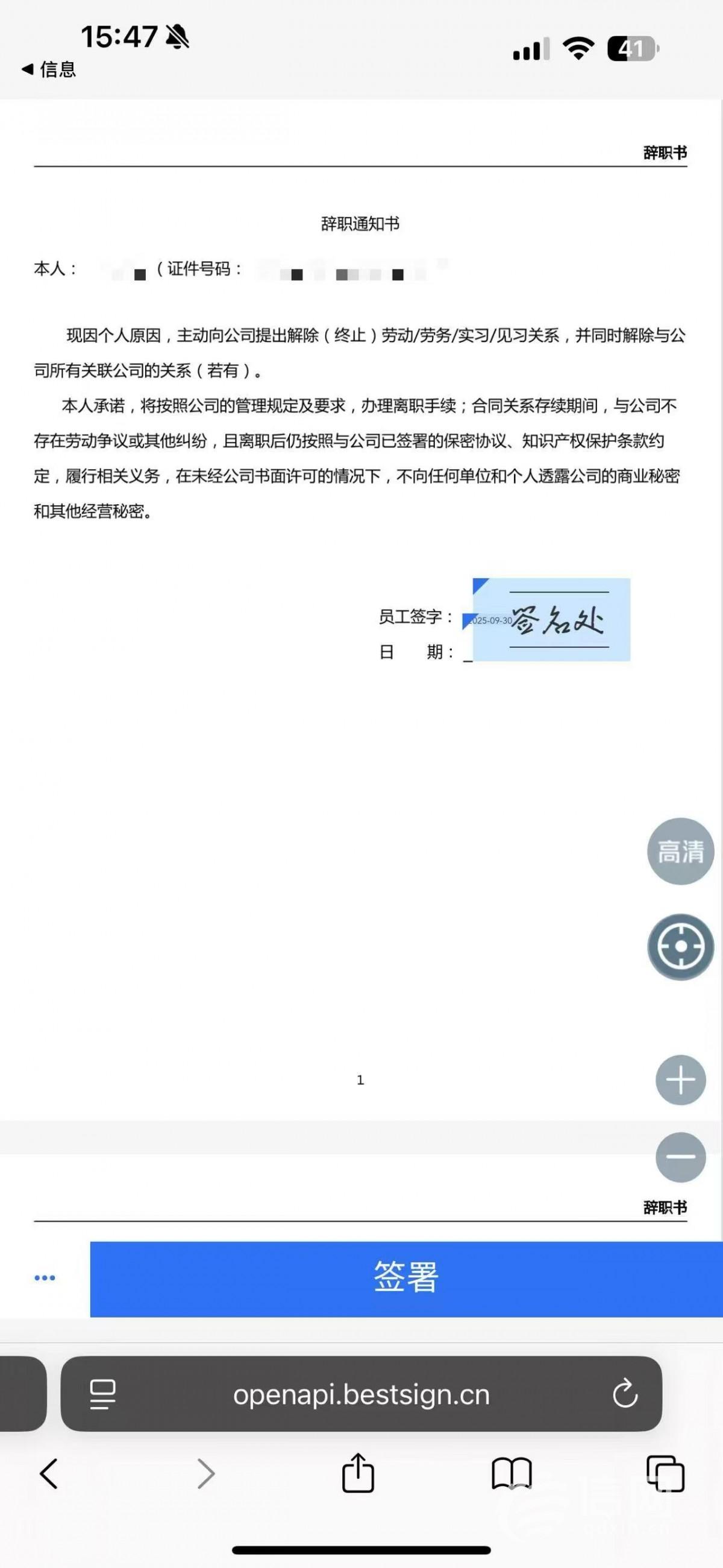 王先生向信号新闻透露,目前公司会向离职员工发送离职书电子签链接,引导大家签署包含“解除与公司及所有关联公司关系”“合同存续期间不存在劳动争议或其他纠纷”等内容的《辞职通知书》。短信中明确强调,此举是“为了保障你的权益,及时获取离职证明。”但对于设置这些内容的原因,公司并未作出解释。“这属于强制性要求,相当于不签这份通知书,就拿不到离职证明。”