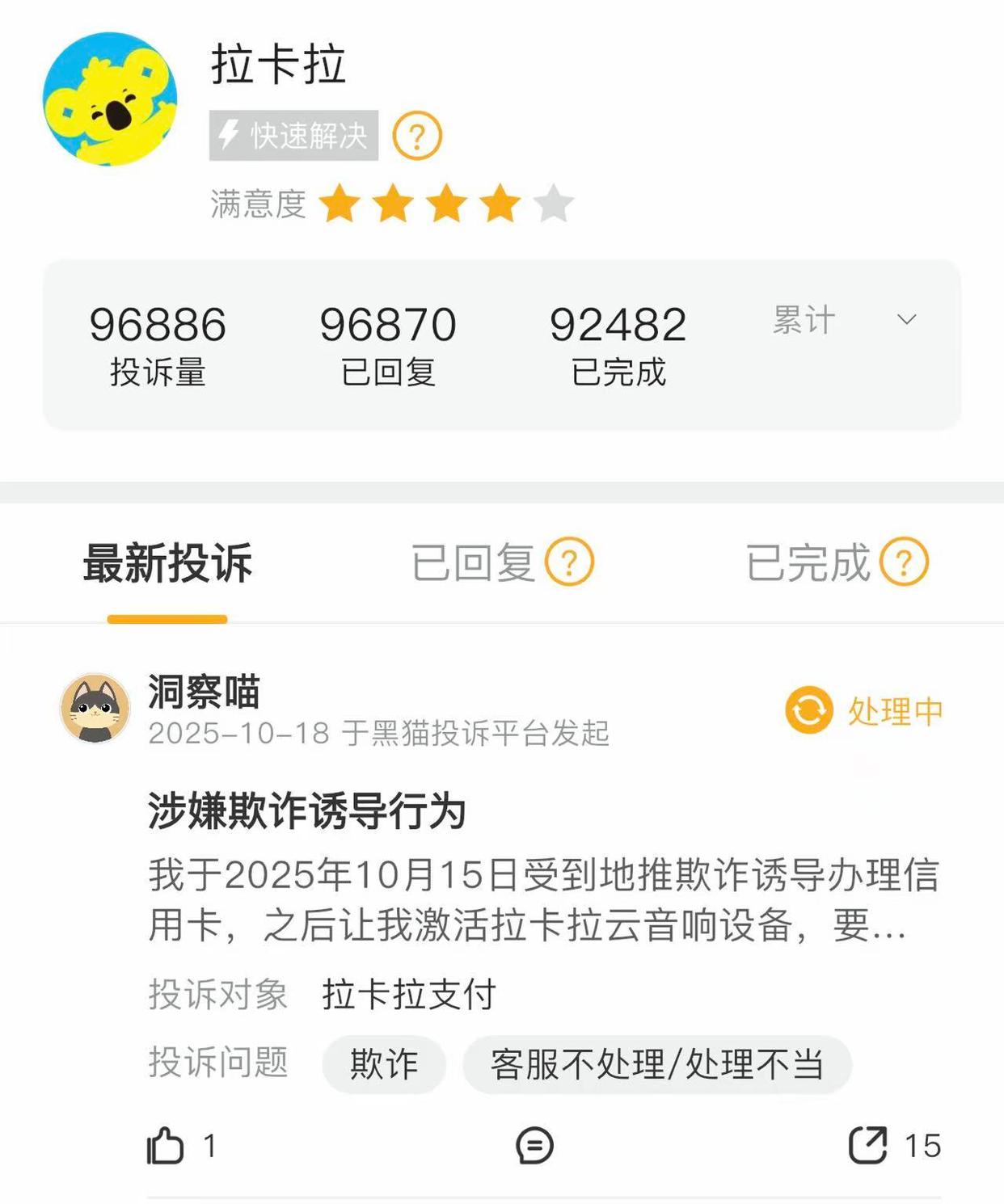“拉卡拉”商家主页显示,目前投诉量累计为96886条。