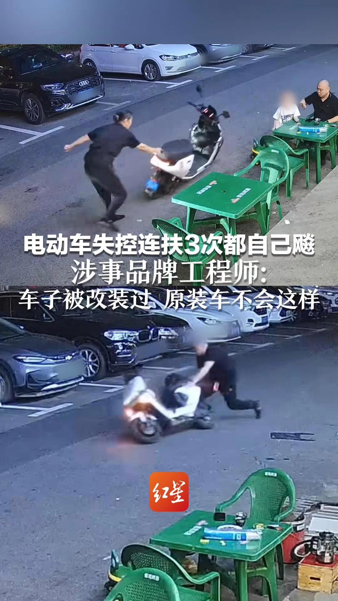 店主上前挪车时,车子又一次失控冲出把人带倒,这种情况总共出现了三次。最后车主到达现场切断了电源,才把“脱缰”的电动车“驯服”,把车推走。