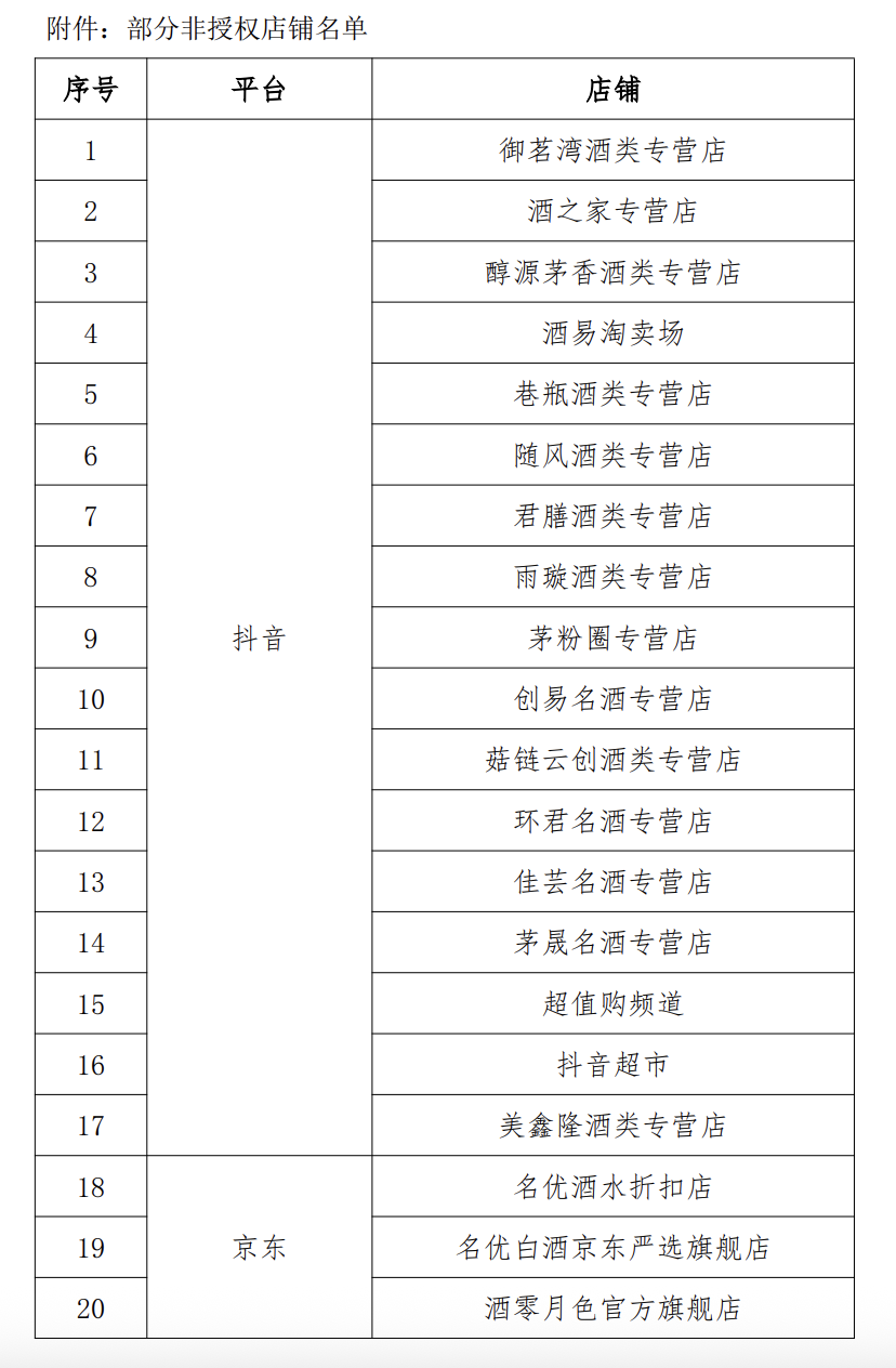 10月19日晚间,五粮液集团官微发布致消费者的告知书,并公布了部分(46家)非授权店铺名单,涉及抖音、京东、快手、美团、拼多多、天猫淘宝等多个平台上店铺。近期,该公司通过市场监测发现,部分网络平台存在非授权门店销售“五粮液”品牌产品的情况,此类行为不仅扰乱了正常的线上销售秩序,更可能为消费者带来多重权益风险。为确保能购买到正品五粮液产品、享受优质消费体验,五粮液集团郑重建议,通过五粮液官网公布的销售渠道购买,并主动索要发票等购买凭证,便于后续溯源验证。
