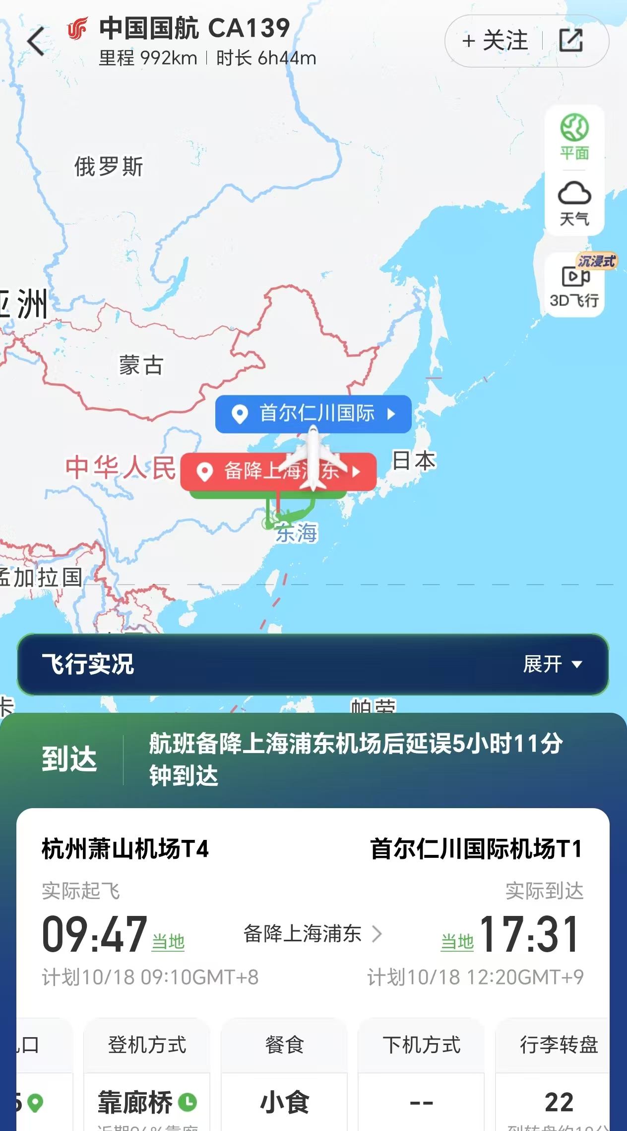 界面新闻查询第三方平台获悉,CA139航班于10月18日早上9点47分从杭州萧山机场起飞,后来备降上海浦东机场,并于下午17点31分达到韩国首尔仁川国际机场。期间延误超过5个小时。