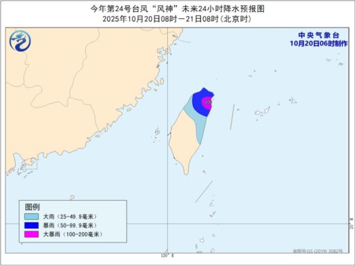 降水预报:20日8时至21日8时,台湾岛北部有大到暴雨,局地有大暴雨(100-200毫米)。
