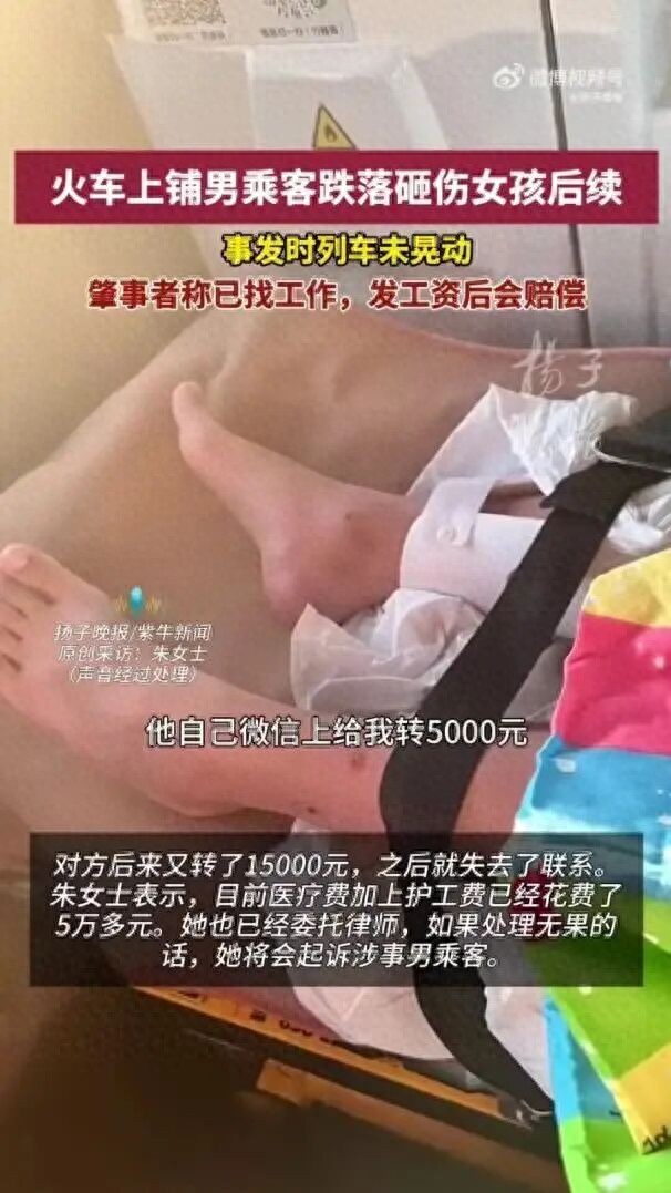 当天凌晨一点多,朱女士和女儿都在熟睡当中,“我突然听到旁边传来‘轰隆’一声,紧接着就听到了女儿撕心裂肺的哭声,我被惊醒后看到一名男乘客压在了我女儿的腿上。”朱女士称,那名男乘客解释说他是睡在上铺的,在爬梯子下来的过程中,因为火车产生了晃动,手没抓稳直接掉了下来,因此摔到了孩子身上。