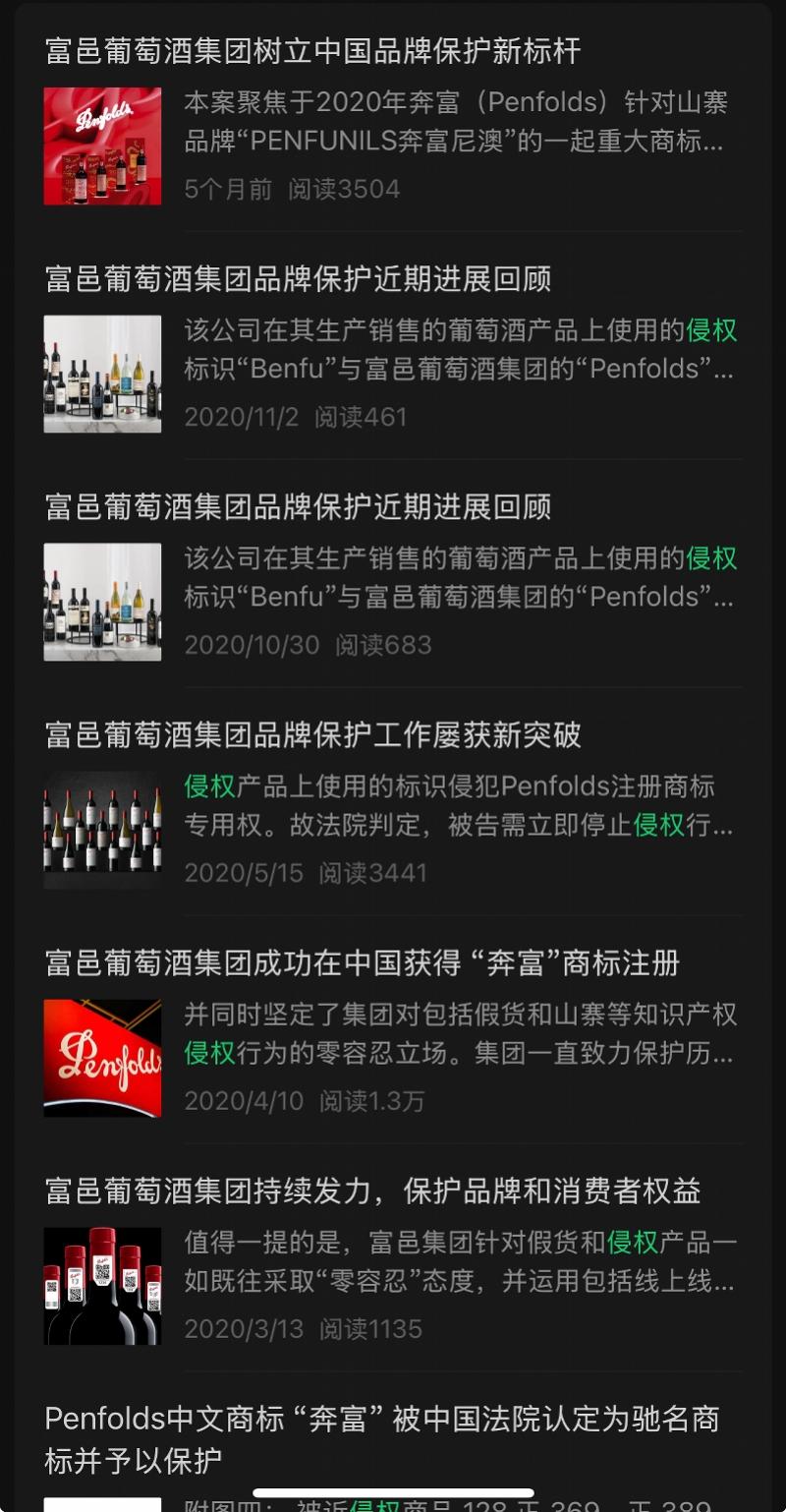 2020年及更早之前,富邑葡萄酒在其微信公众号上会经常发布其商标及打击侵权信息。(截图来源:富邑葡萄酒微信公众号)