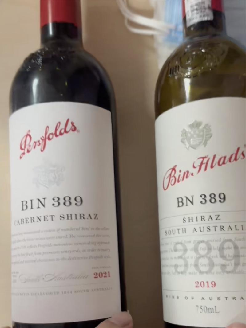 奔富bin 389(左)与奔富海兰 bn389(右),两家为不同企业产品,价格也存在极大差异,一般奔富海兰 bn389价格比较低。(受访者供图)
