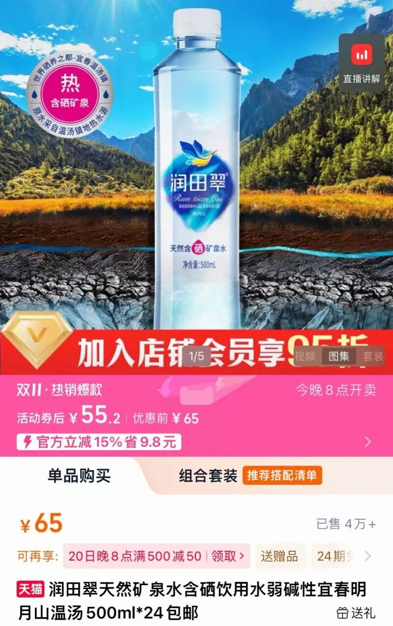 润田天猫旗舰店显示,规格500ml*24瓶的润田翠矿泉水售价65元,约合2.7元每瓶。这一价格甚至高于百岁山等知名矿泉水品牌。