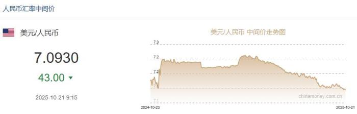 据中国外汇交易中心网站消息,中国人民银行授权中国外汇交易中心公布,2025年10月21日银行间外汇市场人民币汇率中间价为:1美元对人民币7.0930,上调43个基点。
