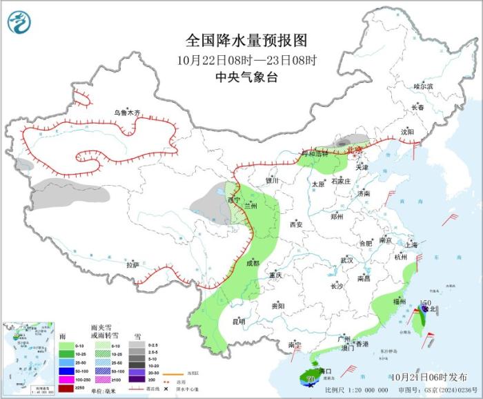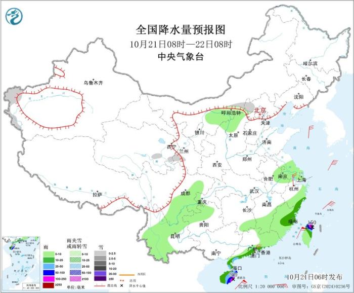 10月21日8时至22日8时,新疆南疆西部山区、内蒙古中部偏南地区、河北北部等地部分地区有小雪或雨夹雪。福建东部、广东西南部沿海、海南岛、台湾岛等地部分地区有中到大雨,其中,海南岛东部、台湾岛北部等地部分地区有暴雨或大暴雨(100~200毫米)。浙江东部、广东南部、广西南部、海南岛等地部分地区有4~6级风,阵风7~8级。