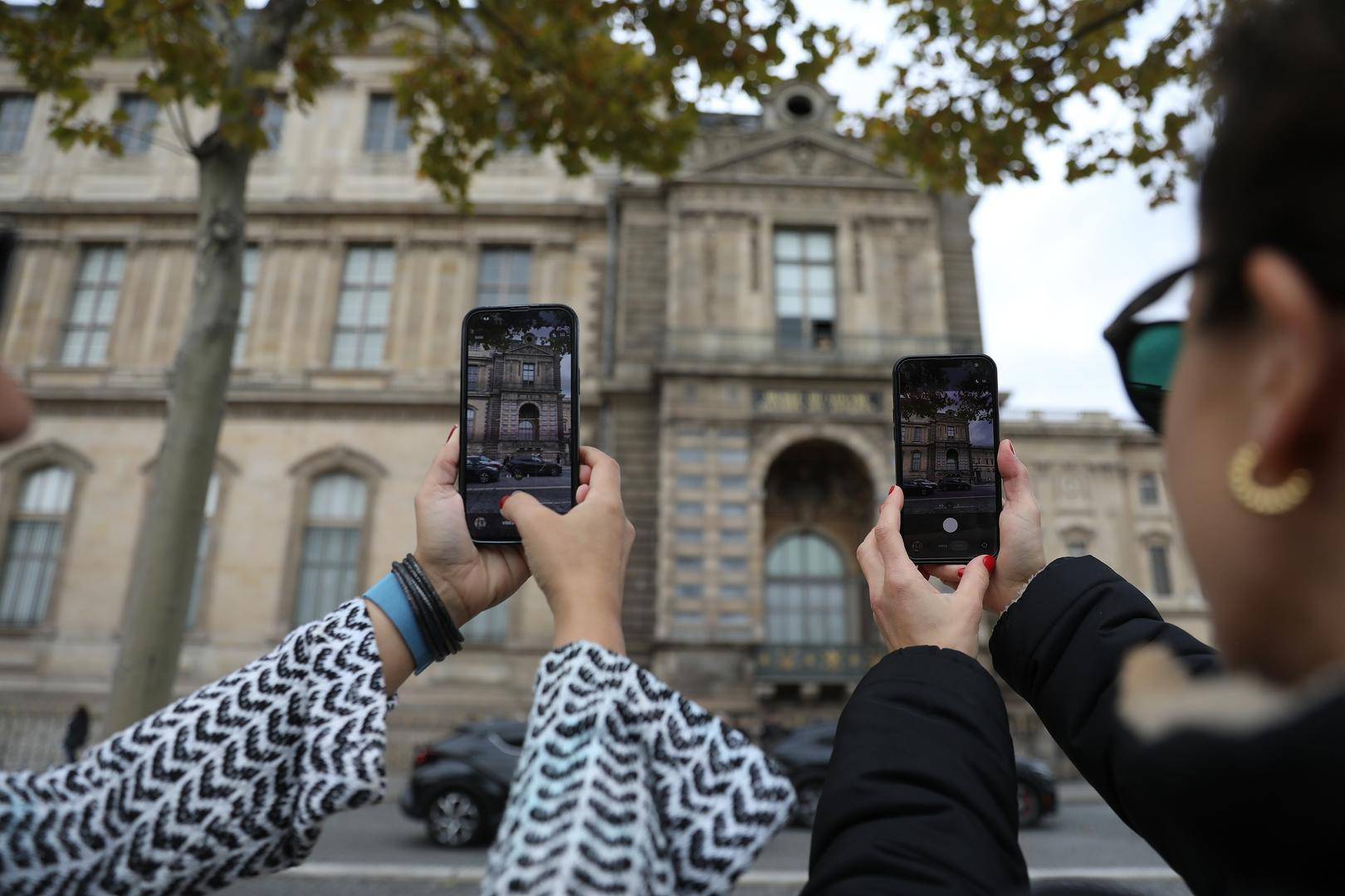 ▲当地时间10月20日,游客在卢浮宫外窃贼入室的窗户处拍照