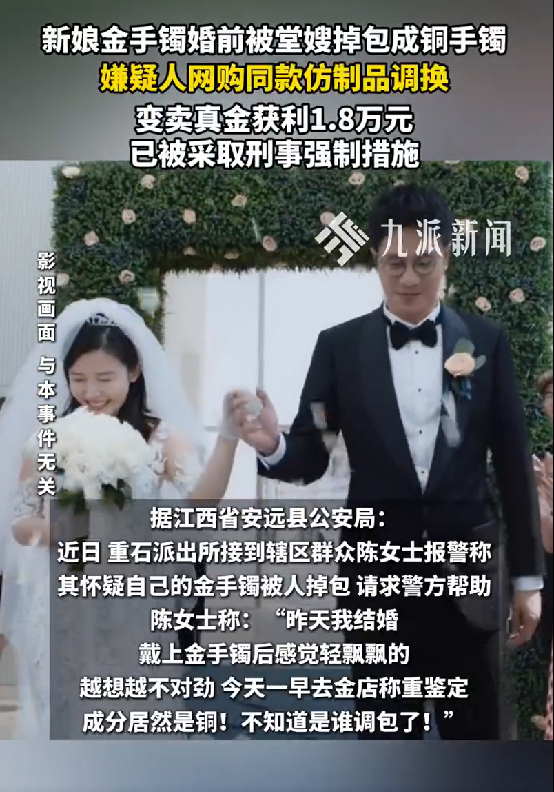 调查显示,9月15日,陈女士在购买金饰后,在家族群“美少女协会”中分享了照片。堂嫂陈某芳见后起了贪念,次日便网购同款仿金手镯。待仿制品到货后,陈某芳趁陈女士婚礼前夕登门做客之机,趁其不备,以假换真,完成掉包。婚礼当天,陈某芳不仅出席仪式,还在婚礼结束后独自打车前往县城,将真金手镯变卖,非法获利一万八千余元。目前,犯罪嫌疑人陈某芳已被警方依法采取刑事强制措施。