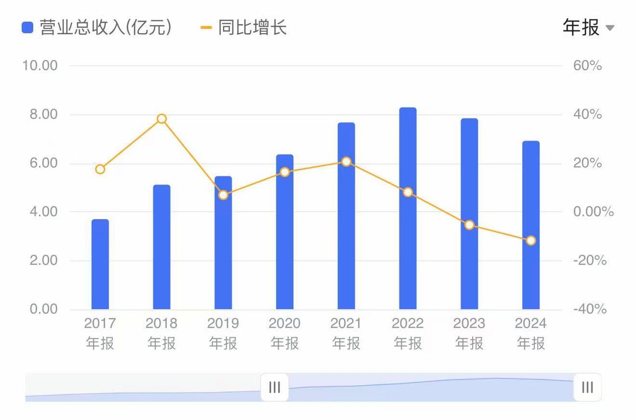寿仙谷自2017年5月登陆上交所以来,营收曾保持连续六年正增长,从上市初期的3.7亿元攀升至2022年的历史峰值8.29亿元,累计增幅达124%。然而,这一增长趋势在2023年首次中断,全年营收同比下降5.39%至7.84亿元。2024年业绩进一步恶化,营收同比降幅扩大至11.81%。