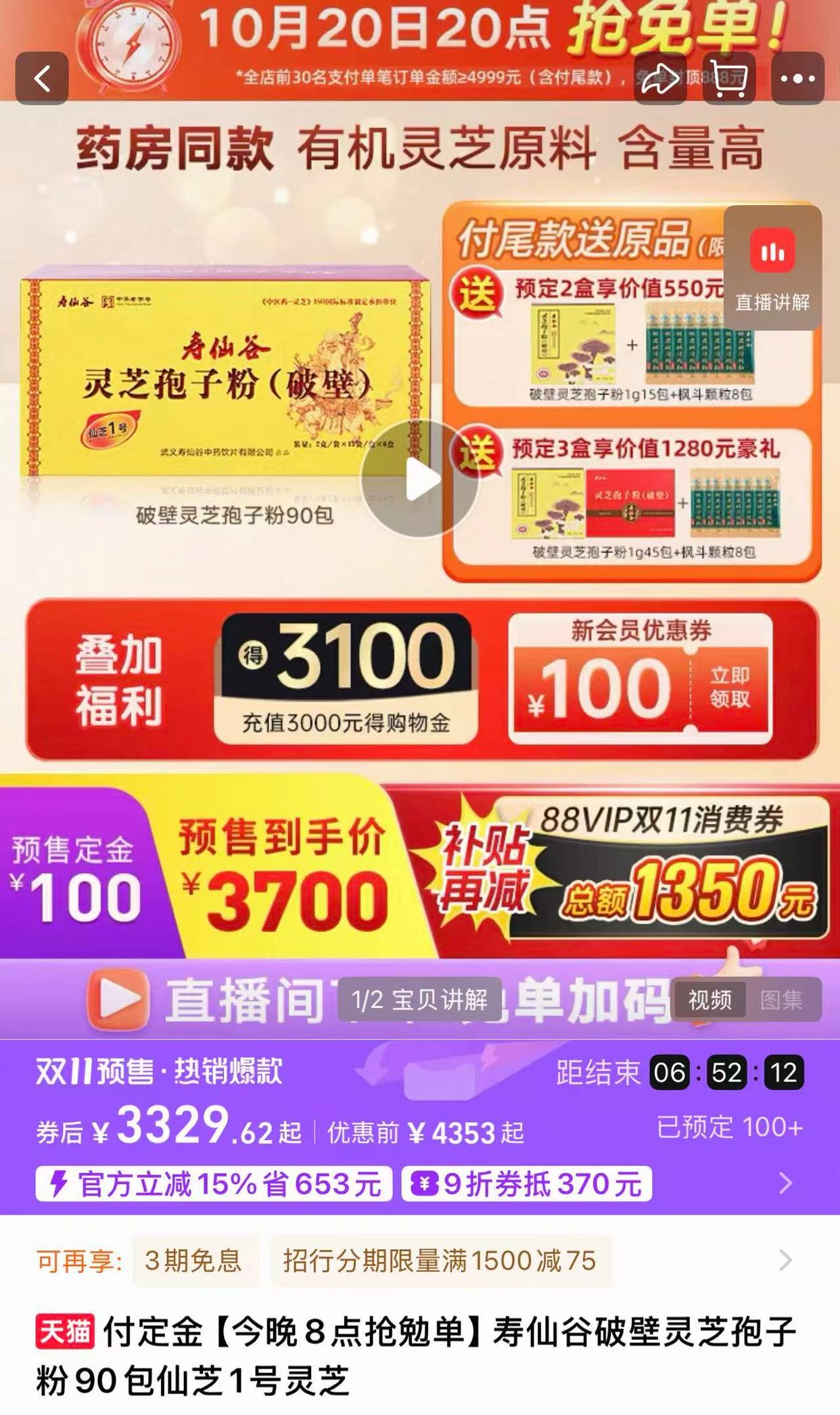 记者查询发现,在“双11”大促来临之际,寿仙谷淘宝官方旗舰店数据显示,优惠后,一盒2g*90包规格的破壁灵芝孢子粉价格仍超3000元。