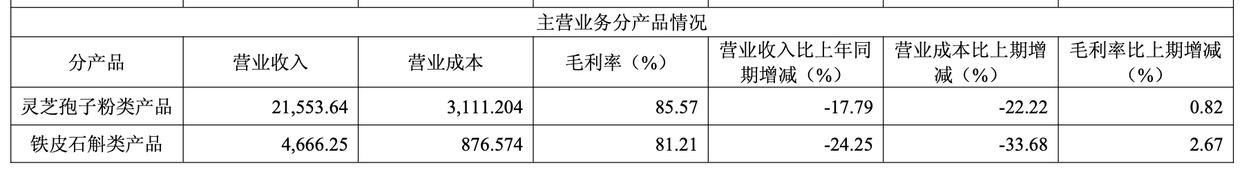 铁皮石斛类产品营收为4666.25万元,占比为15.83%,同比下滑24.25%。