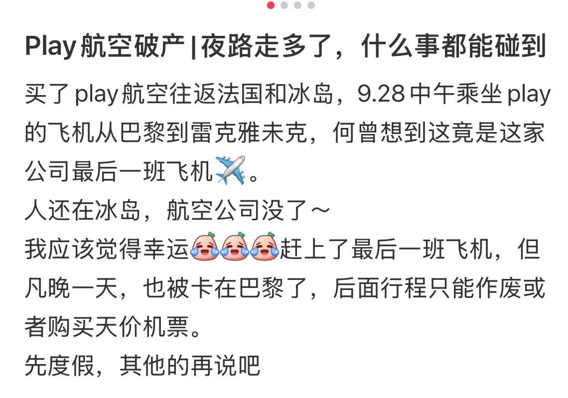 有网友发贴称,买了play航空往返法国和冰岛的机票,9月28日中午乘坐飞机从巴黎到雷克雅未克,何曾想到这竟是这家公司最后一班飞机,人还在冰岛,航空公司没了。“幸运赶上最后一班飞机,但凡晚一天也被卡在巴黎,后面行程只能作废或者买天价票了”。