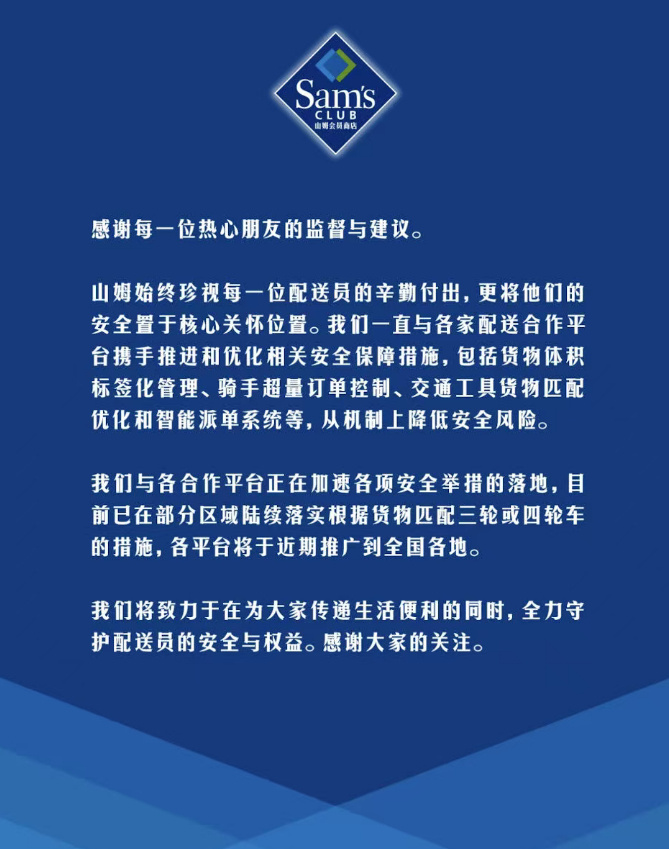 10月21日,山姆会员商店发布关于持续优化配送员安全保障的声明:山姆始终珍视每一位配送员的辛勤付出,更将他们的安全置于核心关怀位置。我们一直与各家配送合作平台携手推进和优化相关安全保障措施,包括货物体积标签化管理、骑手超量订单控制、交通工具货物匹配优化和智能派单系统等,从机制上降低安全风险。我们与各合作平台正在加速各项安全举措的落地,目前已在部分区域陆续落实根据货物匹配三轮或四轮车的措施,各平台将于近期推广到全国各地。