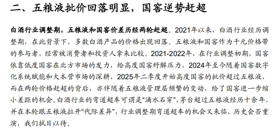 广发证券总结道,“白酒行业的弯道超车可谓是‘滴水石穿’,茅台超过五粮液经历十余年,并在本轮跟五粮液拉开‘代际差异’,行业调整期弯道超车的机会又来临。”